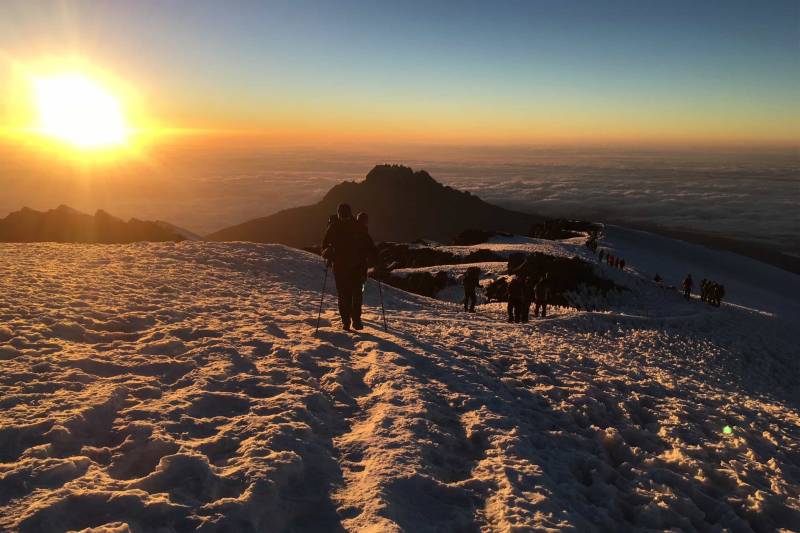 The beginning of this climb is done in the dark and requires headlamps or flashlights. It will be very cold until you start descending, so you will need all of your warm layers. This is by far the most difficult part of the trek with many switchbacks. Going slowly “pole pole†and an optimistic attitude will get you there!