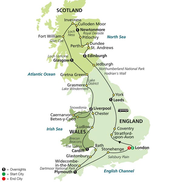 Leaving Wales, cross the Severn Bridge for a visit to the elegant Georgian city of Bath, famed for its Roman relics, before heading into the romantically scenic West Country and Glastonbury with its King Arthur associations. In the heart of Dartmoor National Park, visit quaint Widecombe-in-the-Moor, ghostly setting for Conan Doyle’s The Hound of the Baskervilles. Finally, in Plymouth, hear about Sir Francis Drake and see the Mayflower Steps, where the Pilgrim Fathers embarked in 1620.