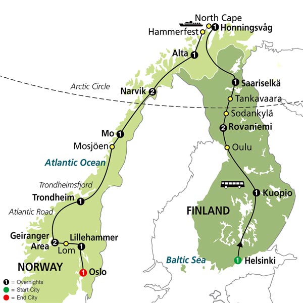 Via Ivalo you cross into Norway for a visit to the fascinating SÁMI PARK. Head farther into Norway and along the beautiful Porsangen Fjord to Honningsvåg on the island of Magerøya, home to 4,000 people and 5,000 reindeer. Tonight, one of the highlights of this tour is the included drive to the NORTH CAPE, Europe’s last northern outpost, on a sheer cliff rising 1,000 feet from the Atlantic Ocean. From May 11 to July 31, if the sky is clear, you’ll see the midnight sun rolling just above the horizon.