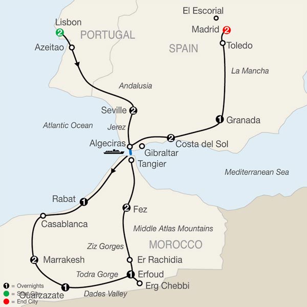 Travel through the sherry wine region of Jerez to Algeciras and enjoy a FERRY RIDE across the Strait of Gibraltar to Morocco. Follow North Africa’s infamous Barbary Coast to Rabat, once a lair of the corsairs and now the country’s capital.